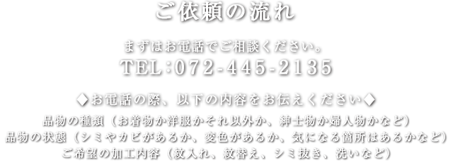| ● | ご希望の加工内容(紋入れ、紋替え、シミ抜き、洗いなど) |