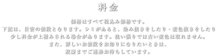 | 参考となる料金の例としましては、最近着られた着物、襟・袖口ふき(水洗い)、汗抜き、シミ数箇所抜き、 |