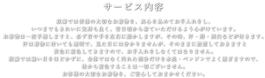 お仕立て上がりのまま、衿・袖口・裾などをはじめ全体的な着物の汚れを落とします。